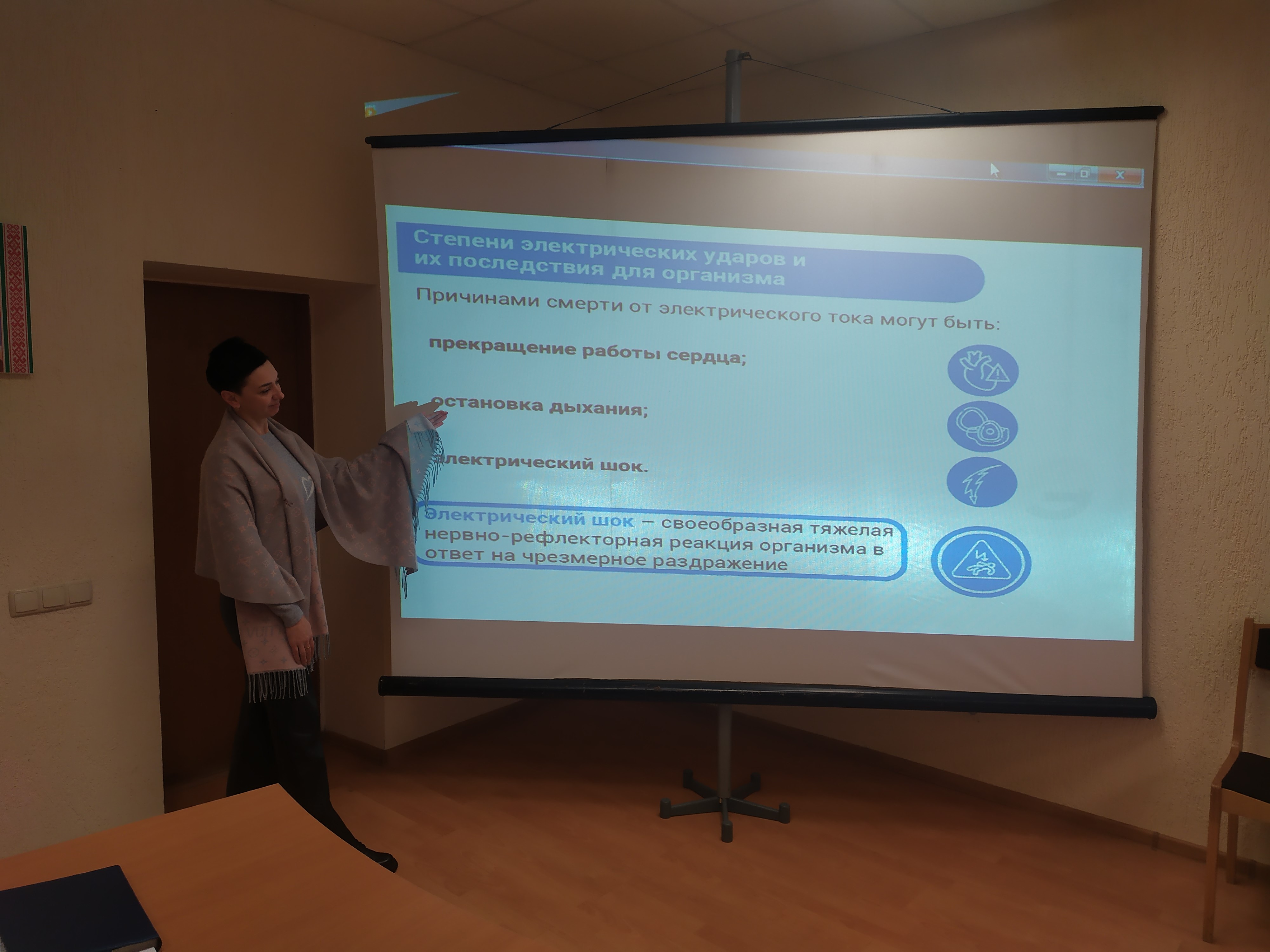 Так же выступила инженер по охране труда Екатерина Куликова, которая рассказала вопросы пожарной и электробезопасности, а также правила оказания первой помощи пострадавшим на производстве, показав соответствующие видеоролики для наглядности.