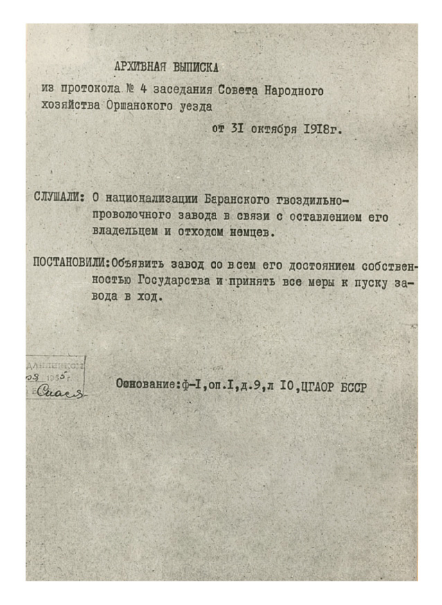 История завода началась в 1873 году, когда местный помещик Игнатий Мокшицкий решает основать в поселке Барань Могилевской области «производство проволочно-волочильное, гвоздильное и производство железного купороса», как об этом свидетельствует «Перечень фабрик и заводов департамента торговли и мануфактур» изданный в Санкт-Петербурге в 1897 году. В народе это производство называлось проще: гвоздильный завод.