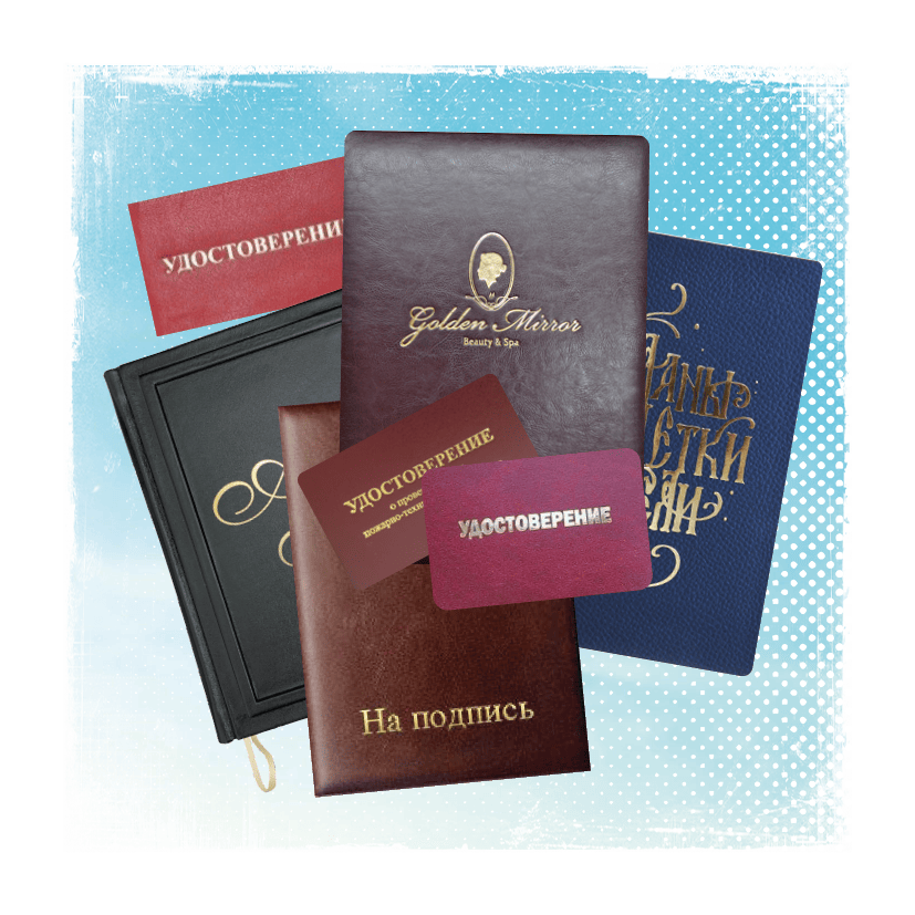 - Папки любых цветов из бумвинила с золотым тиснением (к подписи, к юбилейным праздничным датам).